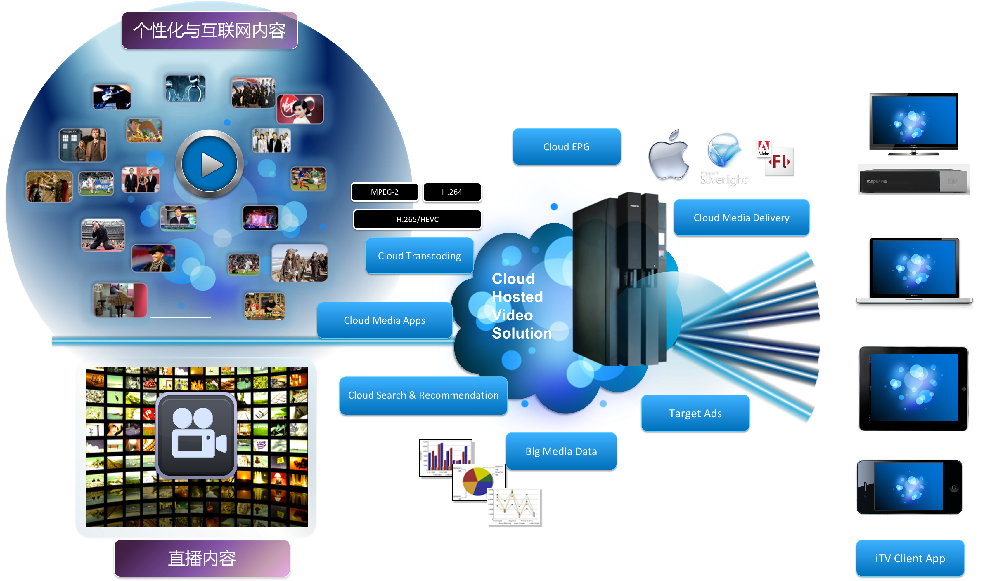 9001cc 以诚为本 9001cc媒体混合云是全媒体平台,是一套面向全网络、全终端、全媒体的智能融合系统;在支持媒体资源管理和分发的基础上,结合大数据技术深度挖掘数据价值,打造了具有经营指导功能的运营管理系统;系统支持集中式部署、分布式部署、混合式部署,多级分级部署。