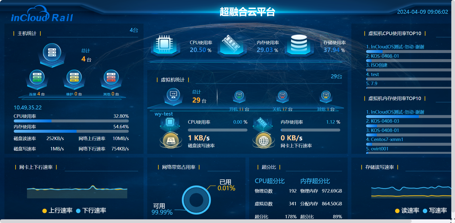 采用自主研发、基于 KVM 深度定制的计算虚拟化软件 InCloud Sphere,支持资源预留、热添加、GPU 直通、vGPU、USB Over IP、 DRS、DRX、裸机管理、虚拟录影机、磁盘双活等多种高级特性