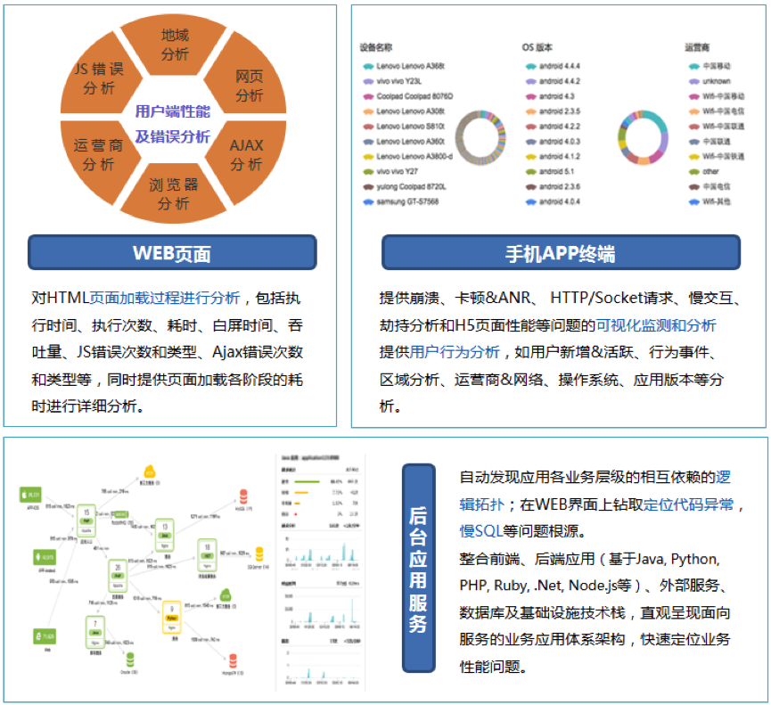 应用质量管控,9001cc 以诚为本 9001cc应用质量管控系统给予对应用全生命周期和全事务过程的质量托管。从用户终端、后台服务到IT设备层的端到端全程监控;应用性能劣化预警;应用性能分析与根原因定位;用户体验分析和问题过程回放;用户活性分析、转化率分析;