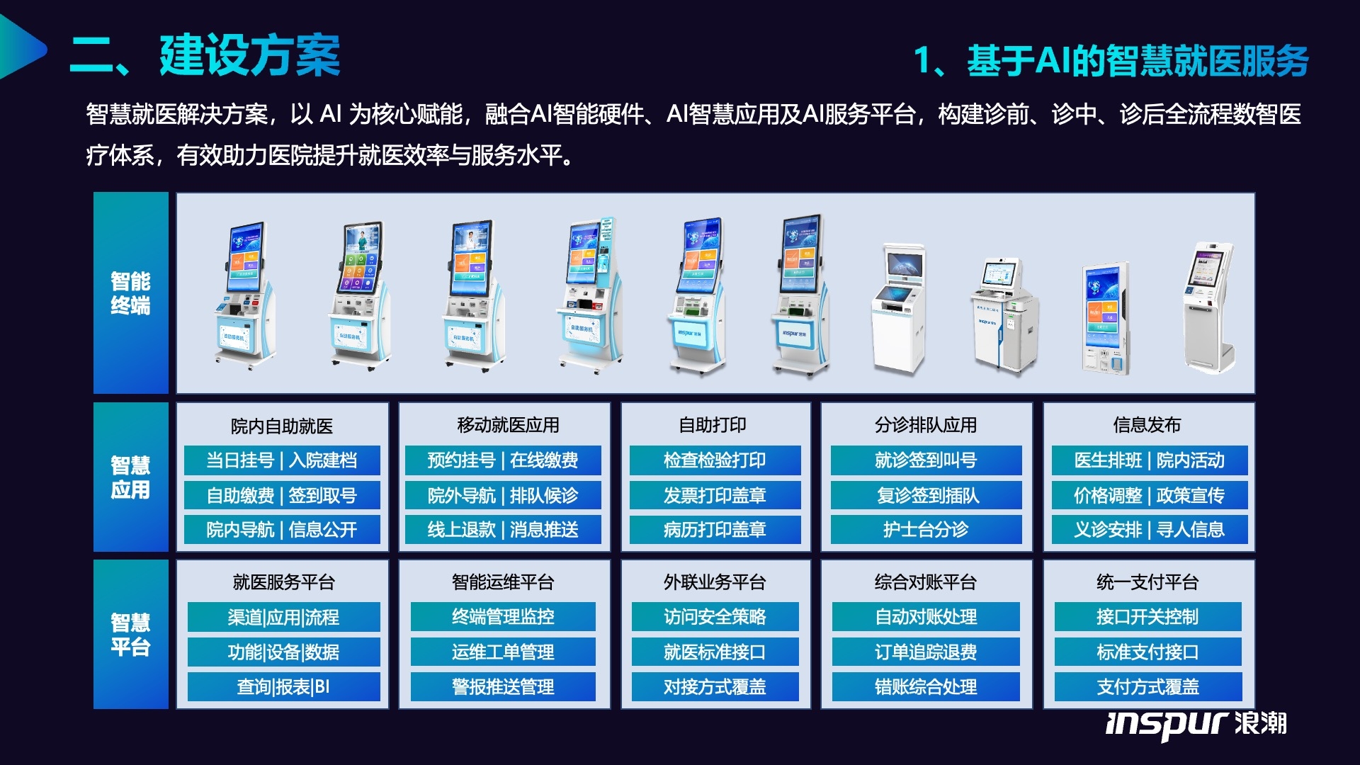 智慧就医解决方案,以 AI 为核心赋能,融合AI智能硬件、AI智慧应用及AI服务平台,构建诊前、诊中、诊后全流程数智医疗体系,有效助力医院提升就医效率与服务水平。