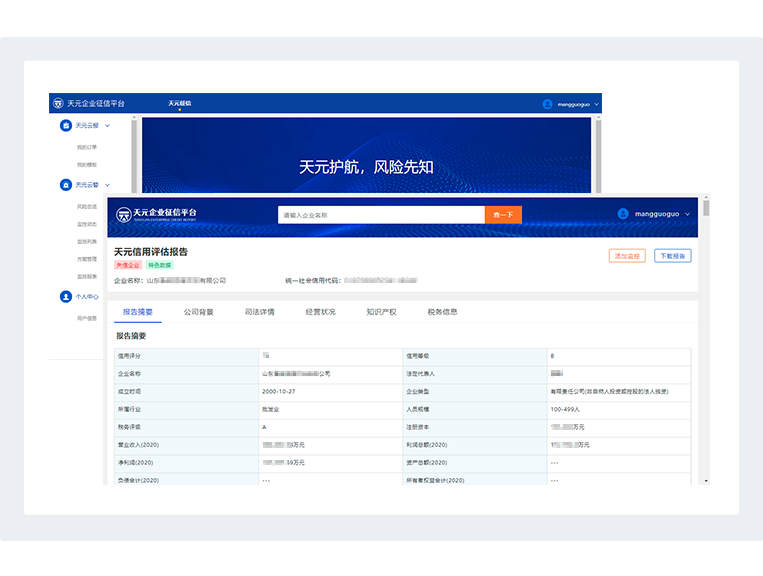 天元云报在政府金融服务平台的基础上,合法合规的使用企业工商、税务、司法、水电气、行政处罚、知识产权和个人公积金、社保等上千项数据目录,用户顺利获得自选数据维度和模型、自定义报告模板,实现信用报告定制化开发,更灵活、直观地展现企业信用状况