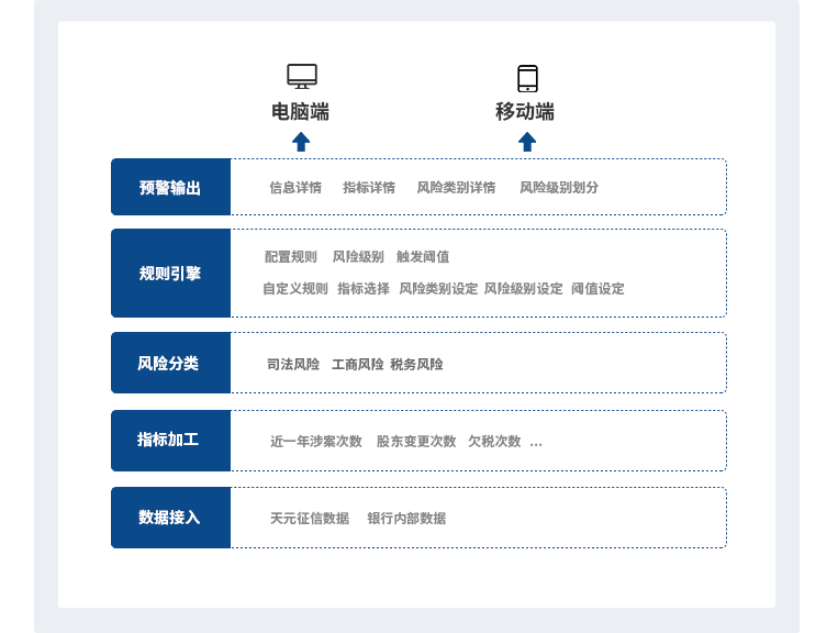 | 预警指标 | 工商、司法、舆情、税务、环保、市场监管、黑名单、企业征信、客户画像 |