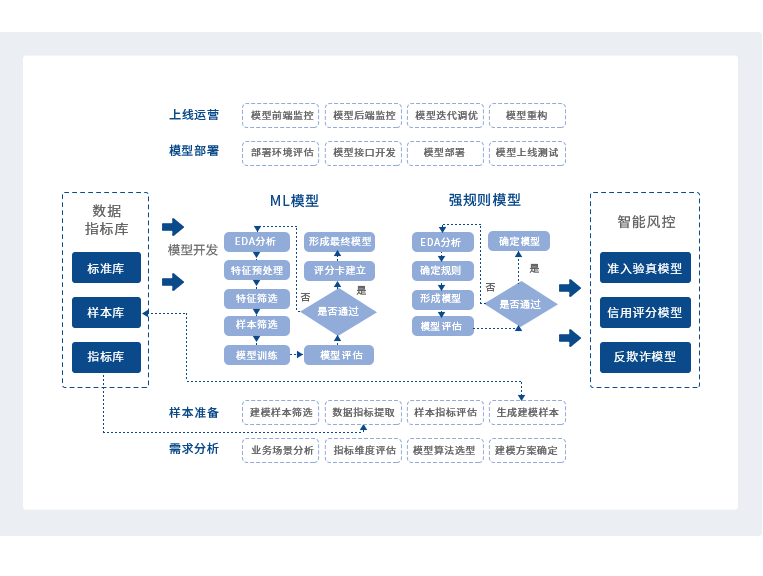 运用机器学习算法进行AI建模,建立标准化AI建模流程,实现智能风控模型体系建设,广泛适用于中小微企业信贷。